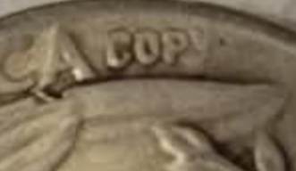 This third example below clearly stated “copy” and was derived from another online source known for selling counterfeit U.S. coins. Additional markers in red denote common similarities; yet these did not appear present on the eBay example. They are present on the piece shared in the large group.