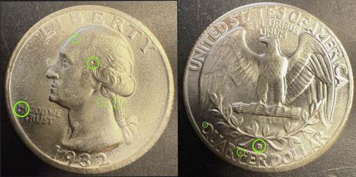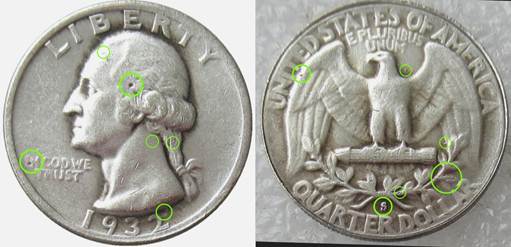 Another internet venue provides us images of a 1932-S that shares this “common obverse.” Highlighted in green are repeating marks for this reverse.