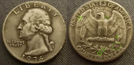 Identifying fakes in both quarters, look for casting bubbles (1. below), undefined rim (2.), wrong date placement (3.) and overall mushy appearance (4.)
