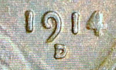 A closeup image of the date and mintmark shows this coin is not a genuine 1914-D. The shape and placement of the mintmark is incorrect. This, however, is not the case of an altered date or an added mintmark; the entire coin is counterfeit.