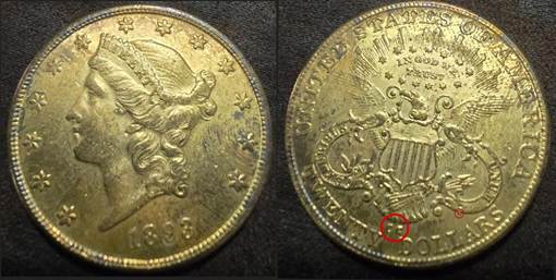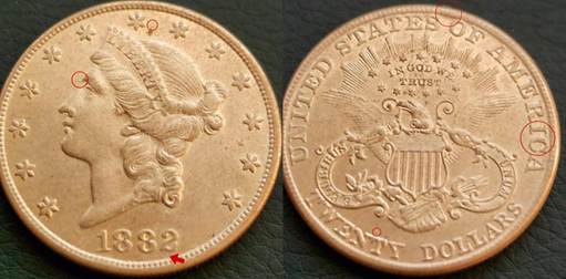 Now to the connection between the common reverses. This 1882-CC shares the “common reverse.” The obverse is very distinct as well for this date. The 1882 date was interchanged with both P and CC mint reverses. Noteworthy: the surface lump above Liberty’s head, spike protruding from the bridge of the nose, and a raised line under the date.