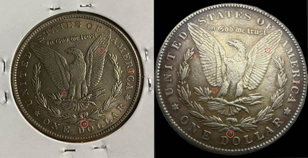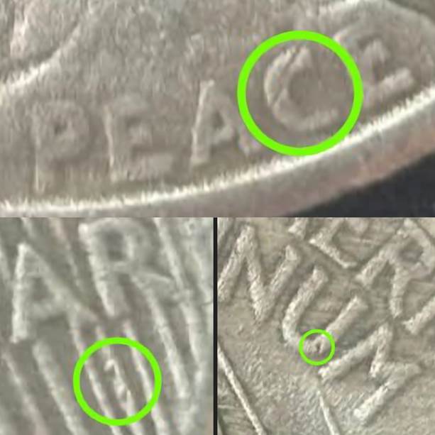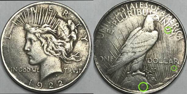 To check if your coin may belong to this “fugazi” (i.e. “fake”), look for those common marks highlighted above in red.