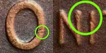A comparison of the reverse shows common circulation marks between the two. A dent in the “O” culminating with the “IN” slash.
